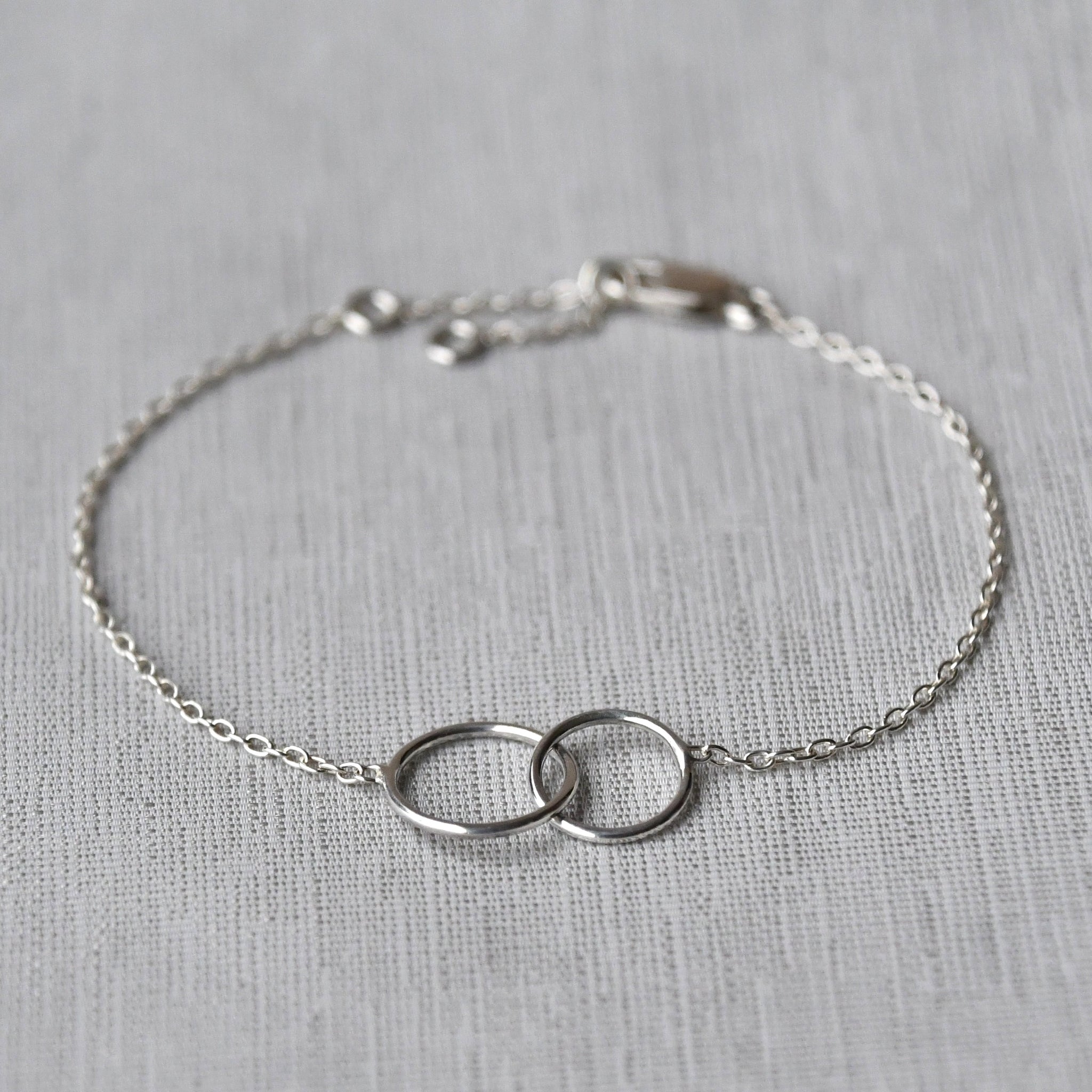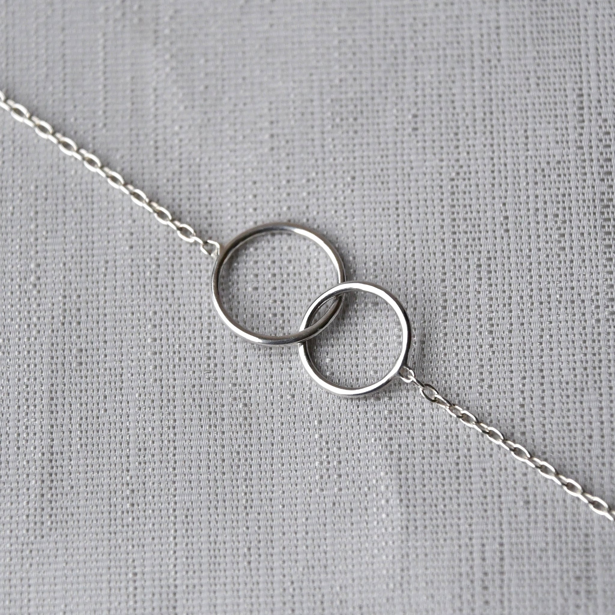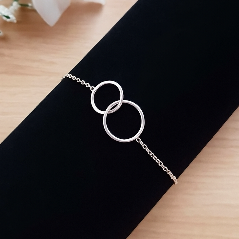 Bracelet fin, intemporel et indémodable en argent avec ses deux cercles entrelacés. Un fermoir menotte qui est fort apprécié pour sa sécurité et sa fiabilité.